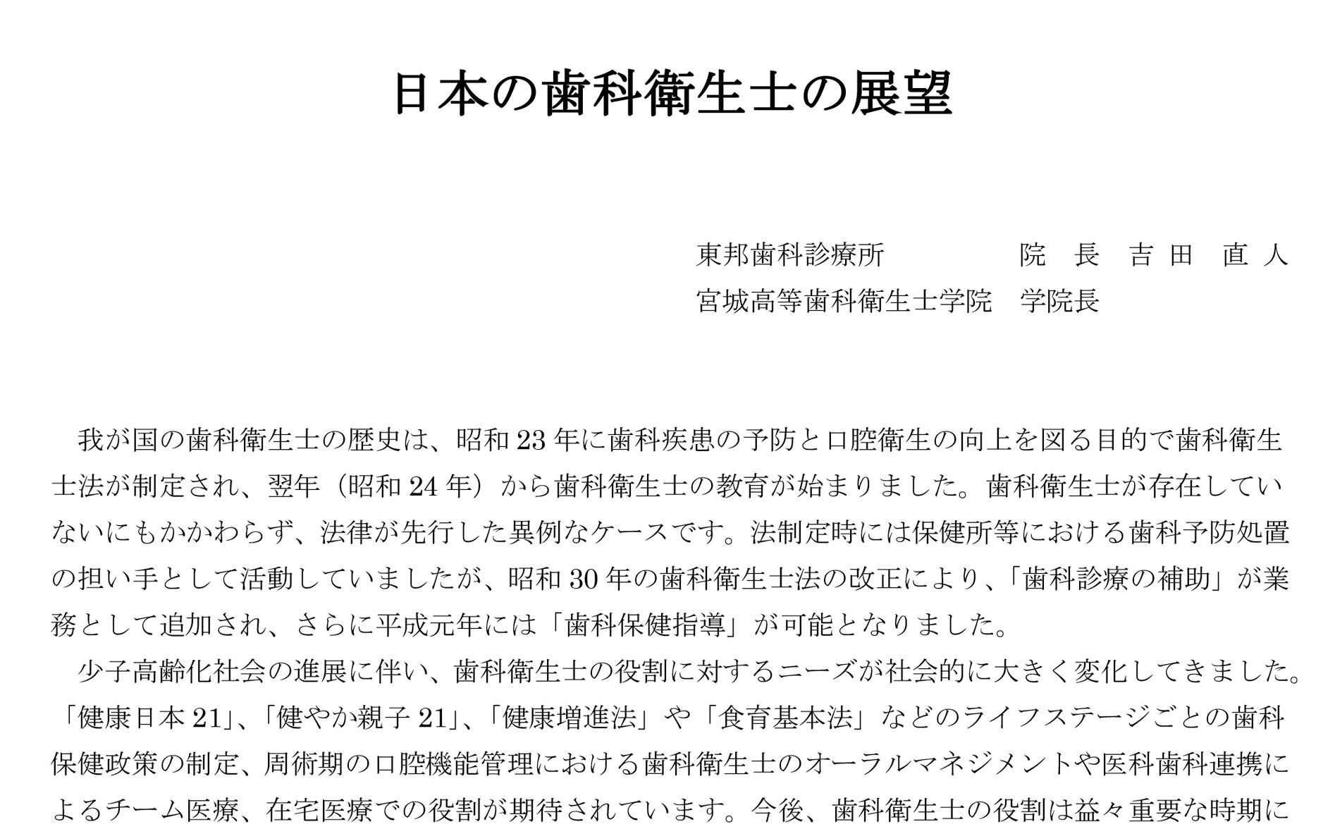 Rapid progress in science! Medical technology has been making rapid progress. We are making an effort based on new knowledge. Because dental treatment is done by a team of professionals such as dentists, dental technicians, dental hygienists and dental assistants. Each professional should have equally high level of knowledge and skills. All together we cooperate each other and make complete treatment possible. Therefore, I emphasize the importance of lifelong learning.